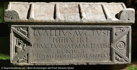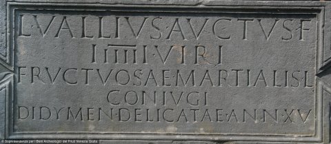 - L(ucius) Vallius Auctus f(ilius) / IIIIIIviri / Fructuosae Martialis l(ibertae) / coniugi / Didymen(i) delicatae ann(orum) XV