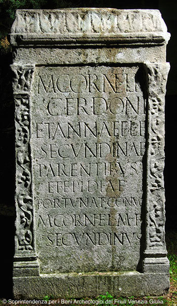 - M(arco) Cornelio / Cerdoni / et Annae(a)e L(uci) f(iliae) / Secundinae / parentibus / et Epidiae / Fortunat(ae) coniug(i) / M(arcus) Cornelius M(arci) f(ilius) / Secundinus