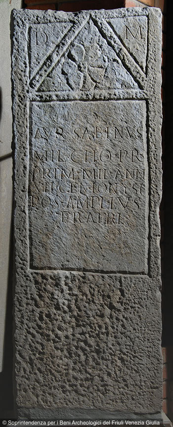 - D(is) M(anibus) / Aur(elius) Sabinus / mil(es) c(o)ho(rtis) pr(aetoriae) / prim(ae) mil(itavit) ann(os) / XII cen(turia) Ionysi / pos(uit) Amplius / fratri