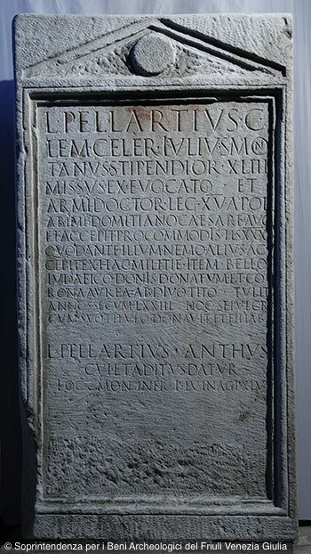 - L(ucius) Pellartius C(ai) (!) / Lem(onia) Celer Iulius Mon/tanus stipendior(um) XLIII / missus ex evocato et / armidoctor leg(ionis) XV Apol(linaris) / ab Imp(eratore) Domitiano Caesare Aug(usto) / et accepit pro commodis HS XXX(milia) / quod ante illum nemo alius ac/ce<p=B>it ex hac militie item bello / Iuda{e}ico donis donatum(!) et co/rona aurea ab divo Tito tulit / annos secum LXXIII hoc sepulcr/um suo titulo donavit et filiab(us) / L(ucius) Pellartius Anthus / cui et aditus datur / loc(us) mon(umenti) in fr(onte) p(edes) LV in ag(ro) p(edes) XLV