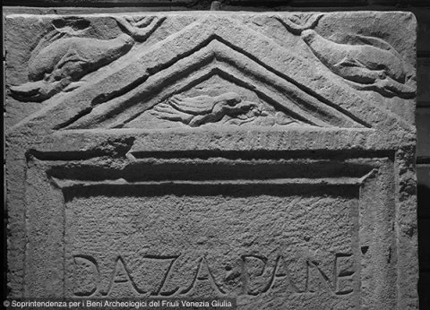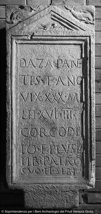 - Daza Pane/tis f(ilius) an(n)o(s) / vix(it) XXX mi/lit(avit) XVI III(trireme) / Corcodi/lo(!) f(ecit) Plusia / lib(erta) patro(no) / suo et sibi // In fron(te) p(edes) IV