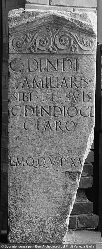 - C(aius) Dindi(us) / Familiaris / sibi et suis / C(aio) Dindio C(ai) l(iberto) / Claro / l(ocus) m(onumenti) q(uo)q(ue)v(ersus) p(edes) XV