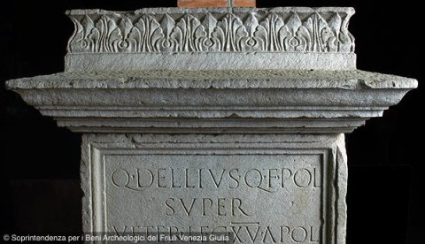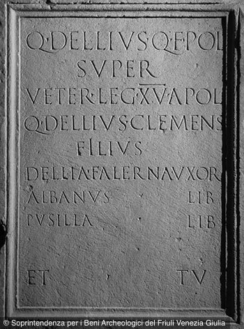 - Q(uintus) Dellius Q(uinti) f(ilius) Pol(lia) / Super / veter(anus) leg(ionis) XV Apol(linaris) / Q(uintus) Dellius Clemens / filius / Dellia Falerna uxor / Albanus lib(ertus) / Pusilla lib(erta) / et tu