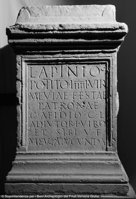 - L(ucio) Apinio / Potito IIIIIIvir(o) / Meviae Festae / patronae / C(aio) Afidio C(ai) l(iberto) / Adiutori viro / et sibi v(iva) f(ecit) / Mevia Iucunda