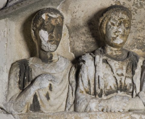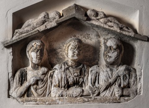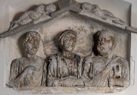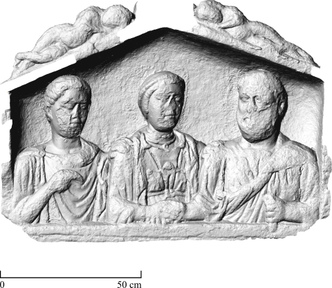 Familie, Genius: in Giebelnische drei Brustbilder. Links Jüngling: bartlios (?), kurze Locken, Tunica, Sagum, Scheibenfibel. In der Mitte einheimische Frau: Haube, gegürtetes Gewand, Fibeln, Brustschmuck , Umhang, Halskette, Halsreif mit Lunula, Armreifen. Rechts Mann: bärtig, Tunica,Toga contabulata, in der Linken Rolle (volumen).