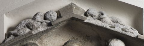 Auf den Giebelschrägen liegende nackte geflügelte (?) Knaben (Genius).