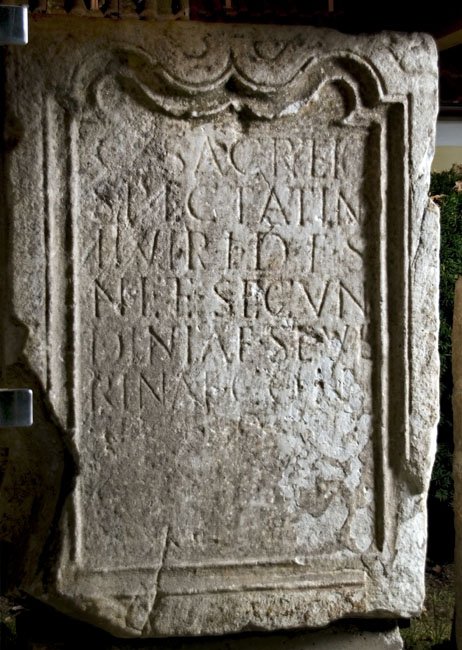 - C(aio) Sacretio / Spectatino / II vir(o) i(ure) d(icundo) F(laviae) S(olvae) / an(norum) L et Secun/diniae Seve/rinae con(iugi) / f(ilii) f(aciendum) c(uraverunt)
