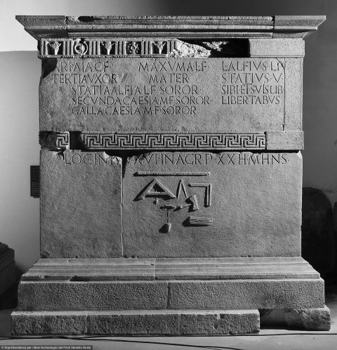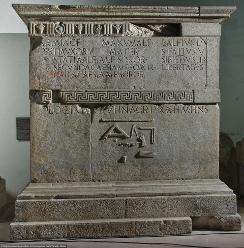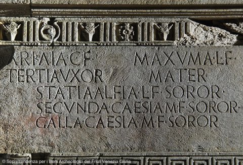 - Arkaia C(ai) f(ilia) / Tertia uxor // Maxuma L(uci) f(ilia) / mater // L(ucius) Alfius L(uci) f(ilius) / Statius v(ivus) / sibi et suis lib(ertis) / lib(ertabus) // Statia Alfia L(uci) f(ilia) soror / Secunda Caesia M(arci) f(ilia) soror / Galla Caesia M(arci) f(ilia) soror // loc(us) in fr(onte) p(edes) XVI in agr(o) p(edes) XX h(oc) m(onumentum) h(eredem) n(on) s(equetur)