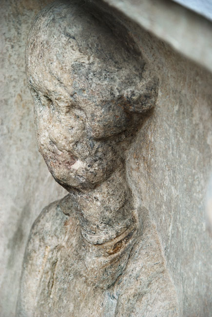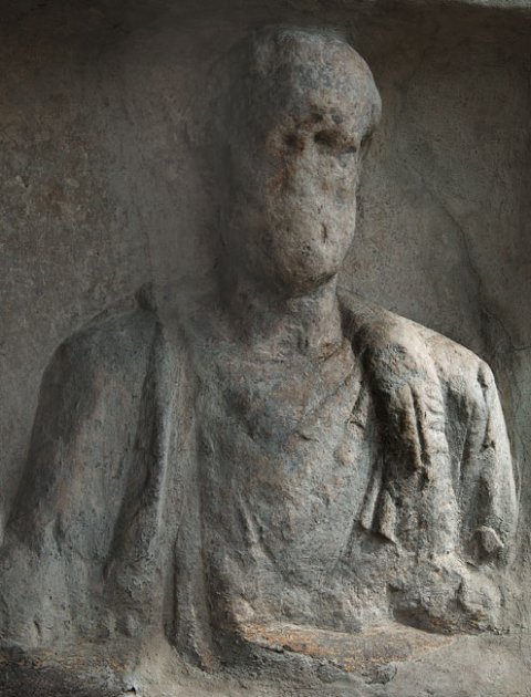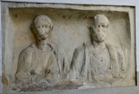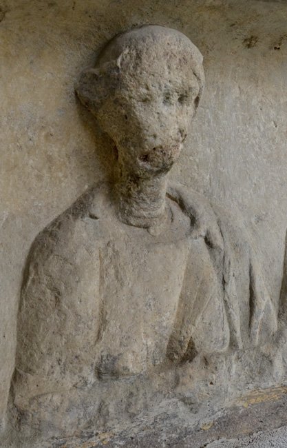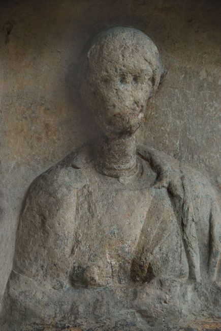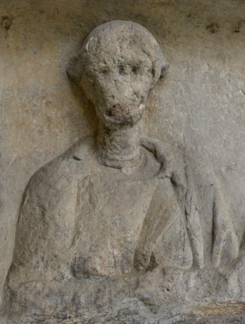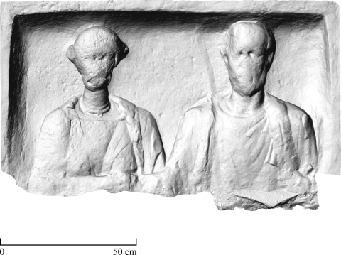 - In Rechtecknische zwei Brustbilder (Ehepaar). Links einheimische Frau: Haube, Umhang, Fibeln, zwei Halsreifen mit Lunula. Rechts Mann: bärtig, Sagum mit Fransen, in der Linken Rolle (volumen).