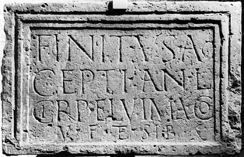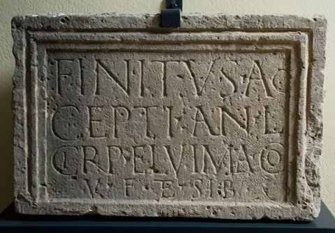 - Finitus Ac/cepti (filius) an(norum) L / Cirp(ia) Elvima co(niux) / v(iva) f(ecit) et sib(i)