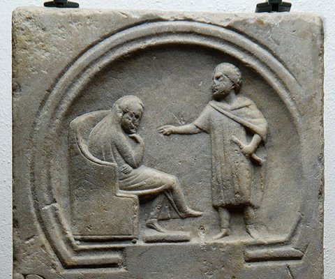 - Bildfeld in hufeisenförmigem Rahmen. Links in Lehnsessel sitzender Mann mit über den Kopf gezogenem Mantel, vor ihm stehender Mann in halblanger Ärmeltunica und Mantel, in der Linken Rolle (volumen): Lehrer und Schüler.