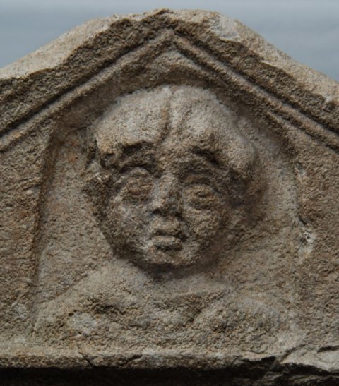 - Kleine Aedicula mit Giebel mit Palmettenakroteren, im Giebelfeld Bogennische mit Büste eines Kindes (Mädchen). Darunter zwischen glatten Pilastern zwei Brustbilder (Ehepaar): links bartloser Mann, rechts Frau, beide in Tunica und Mantel. Auf den Seitenwänden je zwei glatte Pilaster.