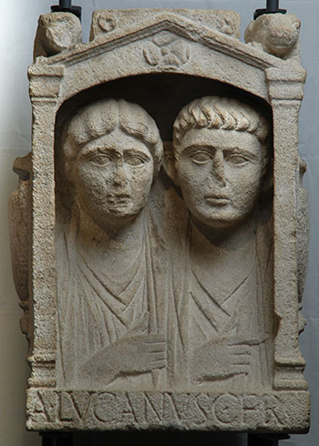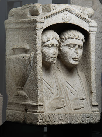 - Kleine Aedicula mit Giebel, auf dem Dach liegende Löwen, auf dem First kubischer Sockel mit Rosetten. Im Giebelfeld Rosetten. Tiefe Bogennische zwischen Pilastern, darin zwei Halbfiguren (Ehepaar): links Frau, rechts bartloser Mann in Tunica und Mantel. Auf den Seitenwänden Amphore.