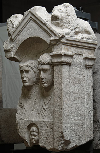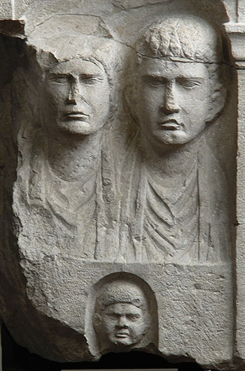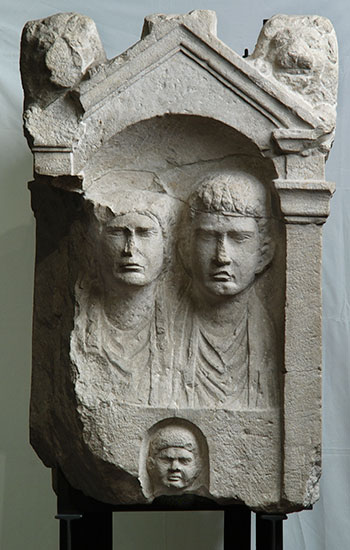- Kleine Aedicula mit nach unten offenem Giebel, auf dem Dach liegende Löwen, auf dem First kubischer Sockel. Tiefe Bogennische zwischen Pilastern, darin zwei Brustbilder (Ehepaar): links Frau, rechts bartloser Mann in Tunica und Mantel. In der glatten Fläche unter den Porträts kleine Bogennische mit Büste eines Kindes (Knabe). An den hinteren Ecken der Seitenwände Pilaster.