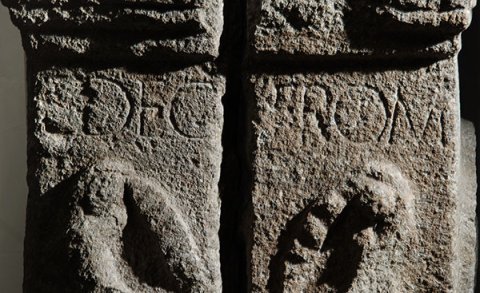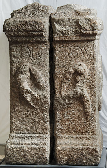- Auf der Vorderseite unterhalb der Inschrift Girlande mit Tänien, auf den Nebenseiten Rundschilde.