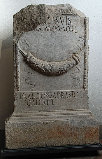 - Unterhalb der Inschrift Girlande mit Tänien, die an Lorbeerstäben aufgehängt ist.