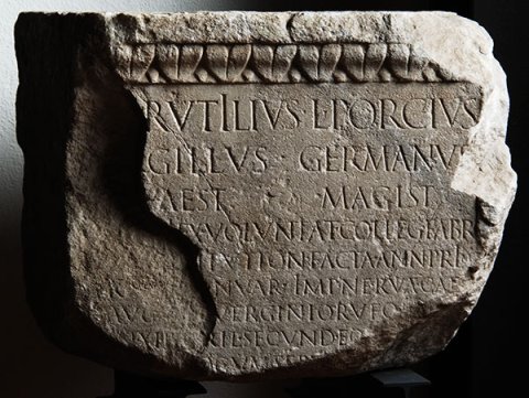 - [-] Rutilius / [Re]gillus / [q]uaest(or) / L(ucius) Porcius / Germanus / magist(er) / [---]i ex voluntat(e) colleg(ii) fabr(um) / [const]itution(e) facta ann(i) prim(i) / Ka[l(endis) Ia]nuar(iis) Imp(eratore) Nerva Cae[s(are)] / Aug(usto) III [L(ucio)] Verginio Rufo III [co(n)s(ulibus)] / [---]i XI K(alendas) [Ap]ril(es) secund(um?) eo[r(um?) legem?] / [--- l]ocum sepu[lchri