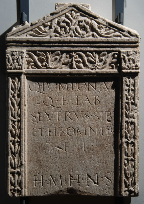 - Q(uintus) Pomponius / Q(uinti) f(ilius) Fab(ia) / Severus sibi / et lib(ertis) omnib(us) / t(estamento) f(ieri) i(ussit) / h(oc) m(onumentum) h(eredem) n(on) s(equetur)