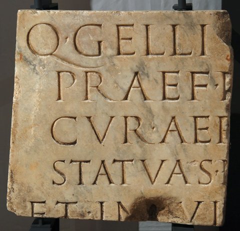 - Q(uintus) Gelliu[s ---] / praef(ectus) f[abr(um) ---] / cur(ator) aer(arii) [---] / statuas I[---] / et in [t]ui[tionem ---] // ---]O L N[---]/[---]O fieri [---] / [---] ERO[---