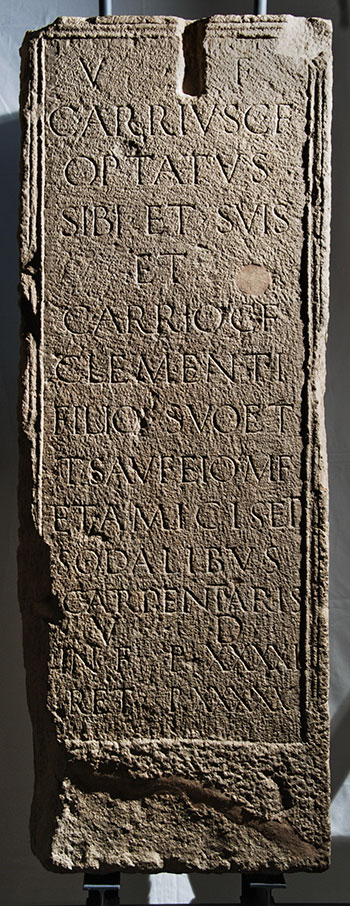 - V(ivus) f(ecit) / C(aius) Arrius C(ai) f(ilius) / Optatus / sibi et suis / et / C(aio) Arrio C(ai) f(ilio) / Clementi / filio suo et / T(ito) Saufeio M(arci) f(ilio) / et amicis et / sodalibus / carpentari(i)s / v(ir) d(evotus) / in f(ronte) p(edes) XXXXI / ret(ro) p(edes) XXXXX