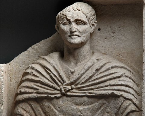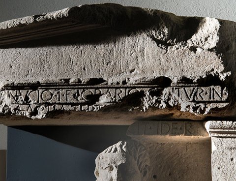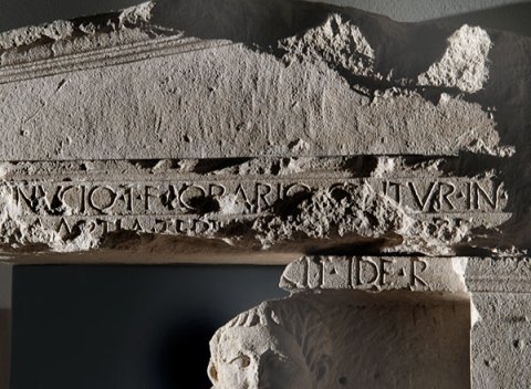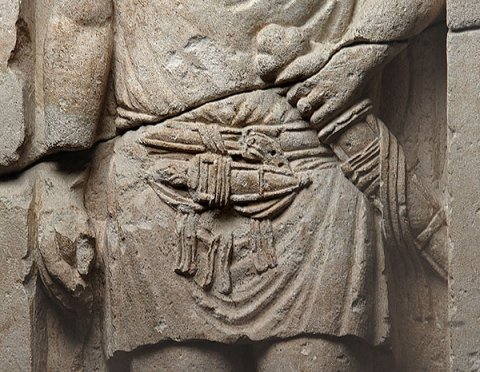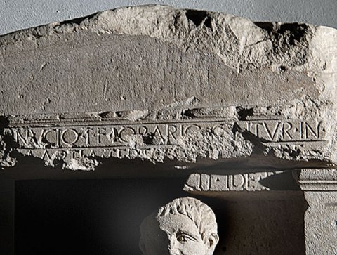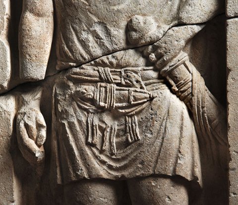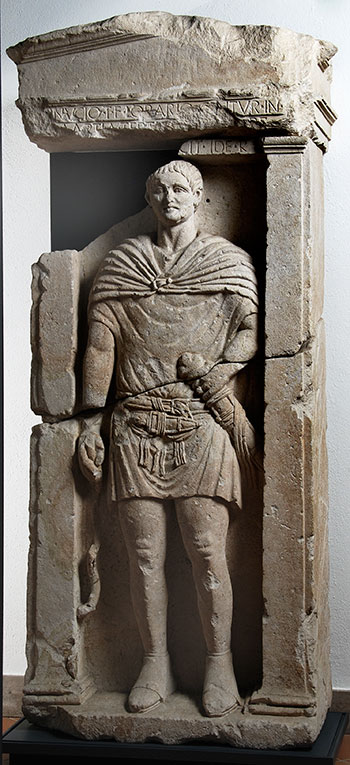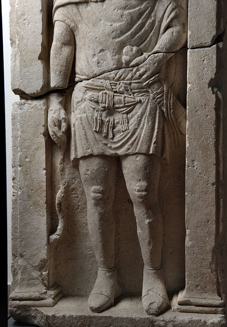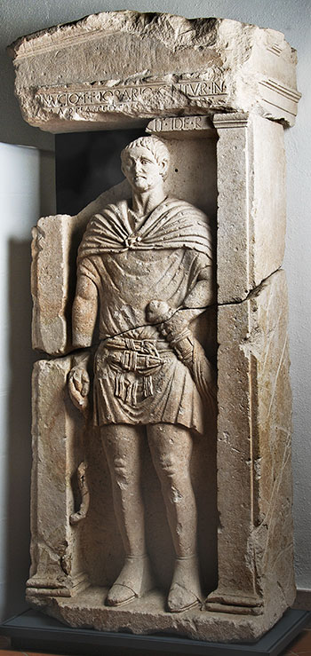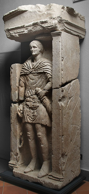 - Gesondert gearbeiteter Giebelblock, Giebelfeld leer, auf dem Architrav Inschrift. Rechteckige Bildnische mit glatten Pilastern. Stehende Ganzfigur eines bartlosen Soldaten (Offizier, centurio) mit Waffen. Kurze gegürtete Tunica, Mantel um beide Schultern vorn mit Scharnierfibel zusammengehalten, am Gürtel hängender Dolch, in der Linken (mit Fingerring) Schwert (gladius), in der Rechten Stock (vitis), Schuhe mit Überschlag.
