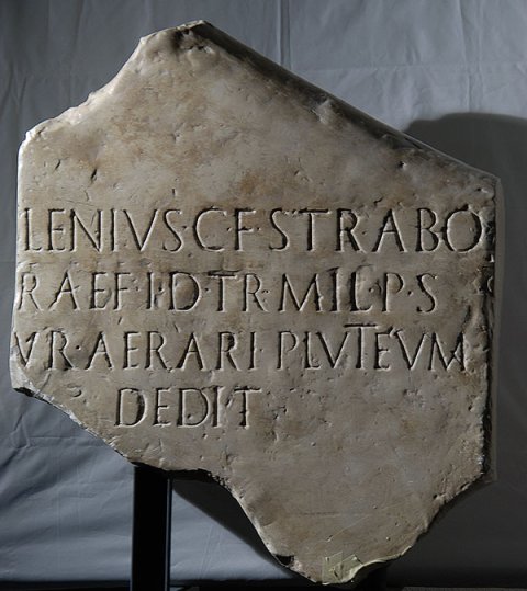 - [- Al]lenius(?) C(ai) f(ilius) Strabo / [p]raef(ectus) i(ure) d(icundo) tr(ibunus) mil(itum) p(opuli) s(uffragio) / [c]ur(ator) aerari pluteum / dedit