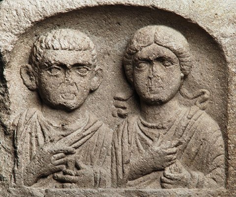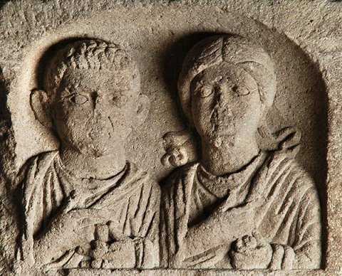 - Bildnische mit flachem Bogen über zwei Brustbildern (Ehepaar). Links bartloser Mann in Tunica und Mantel (Toga ?), in der Linken Rolle (volumen). Rechts Frau mit Schulterlocken, Halsband, Tunica, Mantel, in der Linken Frucht.