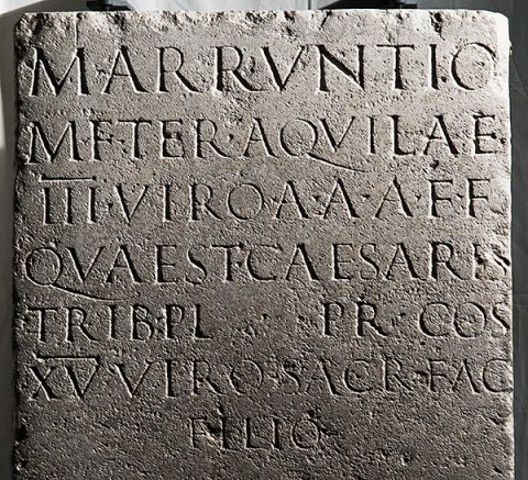 - M(arco) Arruntio / M(arci) f(ilio) Ter(etina) Aquilae / IIIviro a(ere) a(rgento) a(uro) f(lando) f(eriundo) / quaest(ori) Caesaris / trib(uno) pl(ebis) pr(aetori) co(n)s(uli) / XVviro sacr(is) fac(iundis) / filio