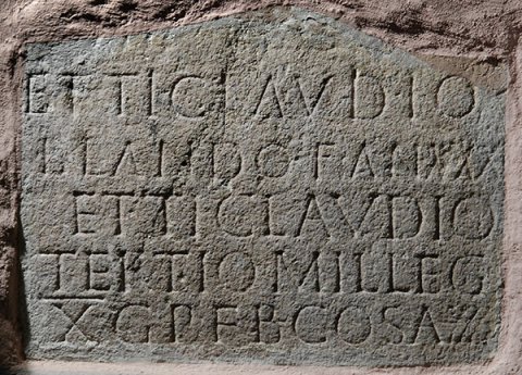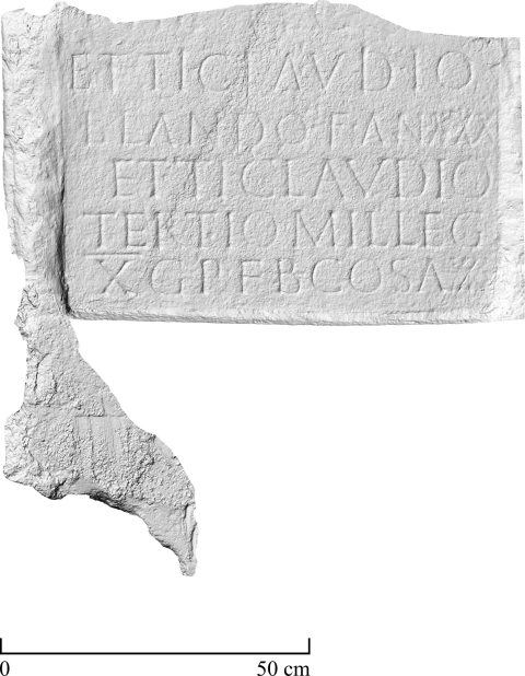 - ---] / [mil(iti)] leg(ionis) [X(?) G(eminae?) P(iae?) F(idelis?)] / et Ti(berio) Claudio / Blando f(ilio) an(norum) XXX / et Ti(berio) Claudio / Tertio mil(iti) leg(ionis) / X G(eminae) P(iae) F(idelis) b(ene)f(iciario) co(n)s(ularis) a(nnorum) XXX