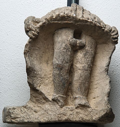 - Mythische Figur: frontal stehender Priapus mit Schuhen. die Hände halten das Gewand in die Höhe, Phallus war gesondert eingezapft.