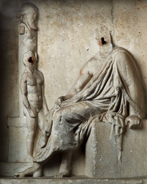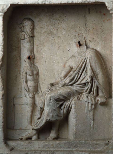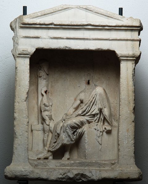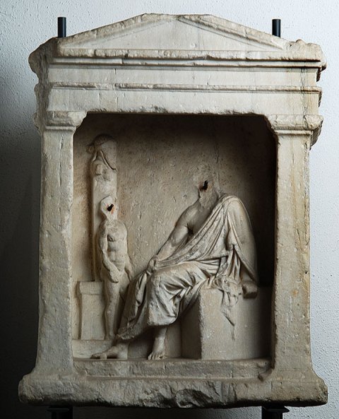 - Giebel, Architrav auf glatten Pilastern, in der tiefen Bildnische rechts auf würfelförmigem Hocker sitzender Mann im Mantel, vor ihm stehender nackter Knabe, hinter diesem Dionysosherme auf hohem Sockel.