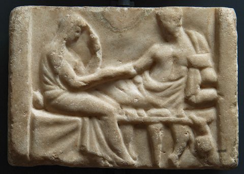 - Totenmahl: auf der Kline gelagerter Mann, links sitzende verschleierte Frau, dreibeiniger Tisch mit Speisen, rechts Hund.
