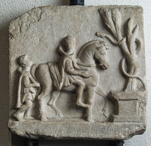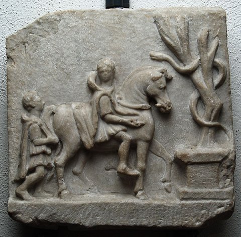 - Thrakischer Reiter (?): Rechts Altar und Baum, um den sich eine Schlange windet. Von links Reiter im Kapuzenmantel mit Schale in der Rechten. Dem Pferd folgt ein Mann in gleicher Kleidung wie der Reiter.