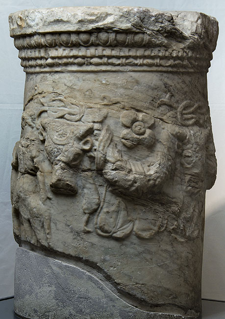 - Unterhalb der Deckplatte Eierstab, Zahnschnitt und Perlstab. Auf dem Altarschaft mit Tänien umwickelte Girlande an Rinderköpfen. Dazwischen Opferszene: Altar mit Bukranion und dünner Girlande zwischen einem Opferdiener links und einem Mann, der einen Widder heranführt, rechts.