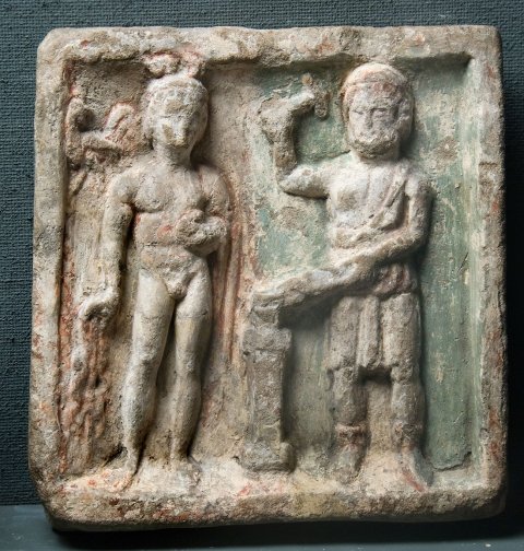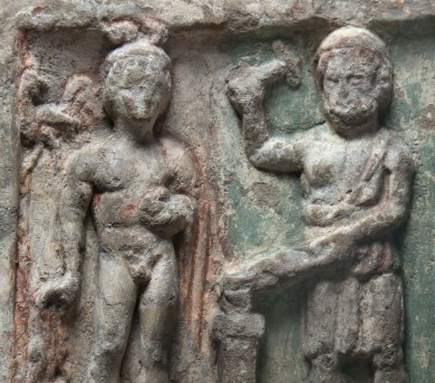 - Mythische Figuren: im einfach gerahmten Bildfeld stehen links Mercur mit Flügelkappe, Mantel über dem linken Arm, die Rechte auf den Caduceus gestützt, in der Linken Geldbeutel, neben der rechten Schulter Hahn, rechts Vulcanus in kurzem Chiton und Schuhen, in der erhobenen Rechten Hammer, in der Linken Zange über dem Amboss.