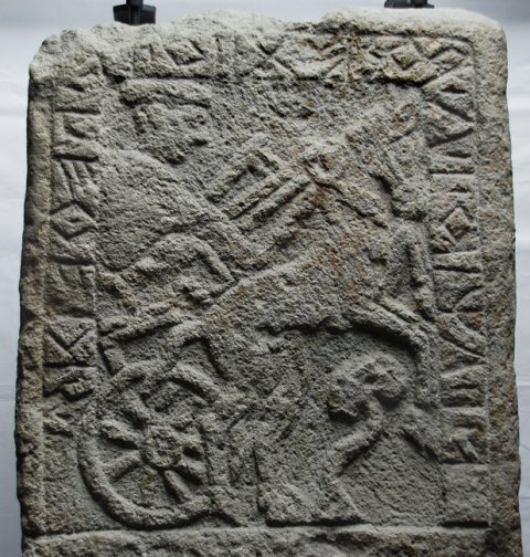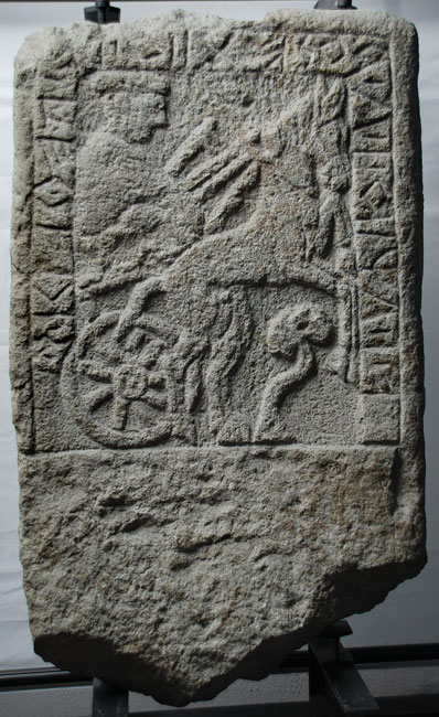 - Wagenszene: Mann mit Hut auf zweirädrigem Wagen mit Zweigespann. Unter den Pferden kleiner Baum. Venetische Inschrift auf drei Seiten umlaufend auf der durch Ritzlinien abgeteilten Rahmenleiste.