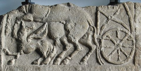 - Wagenszene: nach links galoppierendes Zweigespann mit zweirädrigem Wagen. Unter den Pferden geflügelter Greif.