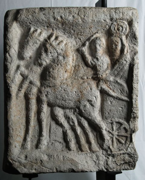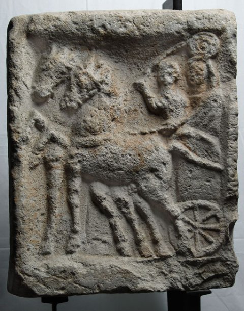 - Wagenszene: nach links gehendes Zweigespann mit zweirädrigem Wagen mit Wagenlenker und hinter ihm stehender Frau mit runder Scheibe über dem Kopf. Inschriftreste auf der oberen Rahmenleiste.