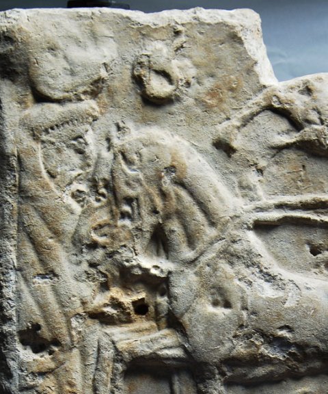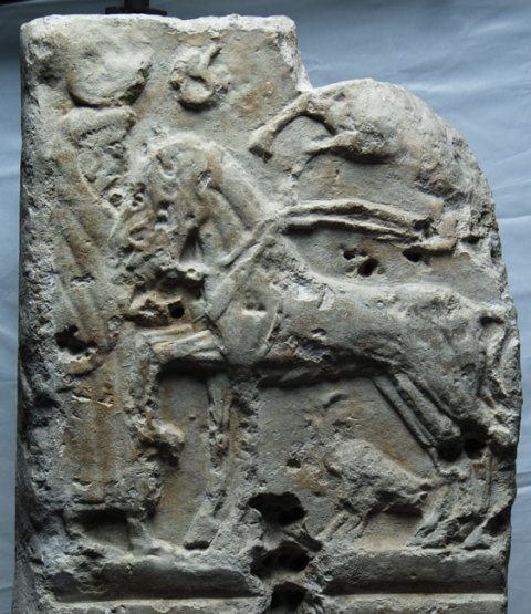 - Wagenszene: Zweigespann nach links, vor den Pferden stehende Frau mit Gefäß (?) auf dem Kopf, über den Pferden schebendes Tier (Greif ?), unter den Pferden Vogel.