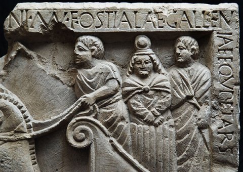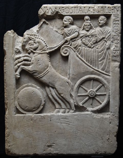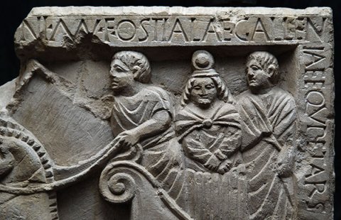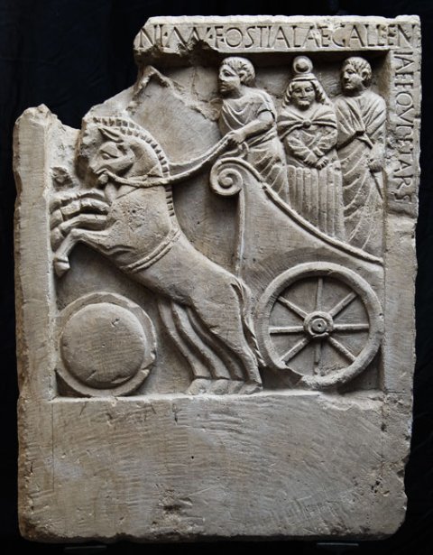 - Wagenszene: Zweigespann nach links, zweirädriger Wagen mit Wagnelenker, frontal stehender Frau mit runder Scheibe auf dem Kopf und Mann in Toga. Unter den Pferden Rundschild.