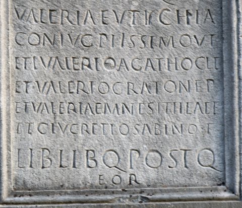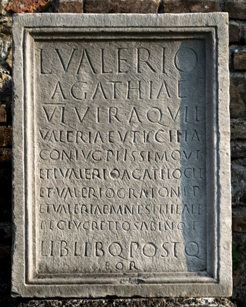 - L(ucio) Valerio / Agathiae / VI vir(o) Aquil(eiae) / Valeria Eutychia / coniug(i) piissimo v(iva) f(ecit) / et L(ucio) Valerio Agathocli / et Valerio Grato nep(otibus) / et Valeriae Mnesitheae f(iliae) / et C(aio) Lucretio Sabino f(ilio) / lib(ertis) lib(ertabus)q(ue) post(eris)q(ue) / eo(rum)
