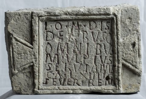 - I(ovi) O(ptimo) M(aximo) dis / deabusq(ue) / omnibus / M(arcus) Ulpius / Servianus / c(ustos) a(rmorum) l(egionis) XIIII G(eminae) / Sever(ianae) ren(ovavit?)