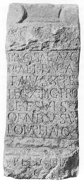 - [------] / pro sal(ute) Aug(usti) P(ublius) Ael(ius) Paca/tianus b(ene)f(iciarius) leg(ati) / leg(ionis) XIIII G(eminae) pro / se et suis / omnibus v(otum) s(olvit) / Pompeiano / e[t] P(a)elignia[no] / co(n)s(ulibus)
