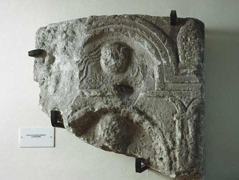 Halbrunder Abschluss mit breitem abgestuften Rahmen, im Bogenfeld Gorgoneion, als Seitenakroter Pinienzapfen.
