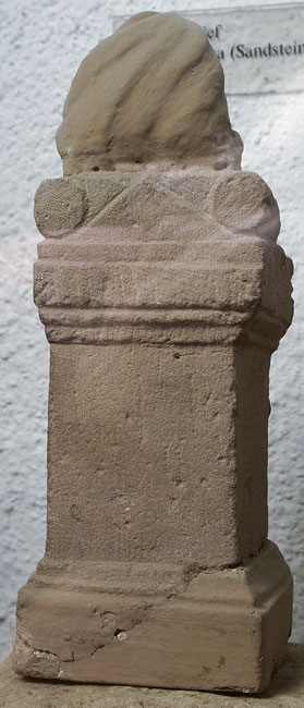 - Kleiner Altar mit Giebelfeld zwischen pulvini, oben stilisierte Flamme;