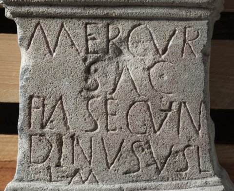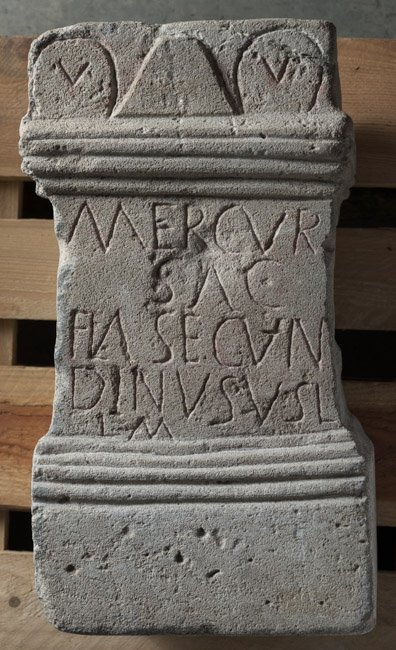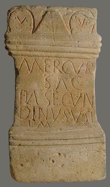- Mercur(io) / sac(rum) / Fla(vius) Secun/dinus v(otum) s(olvit) l(ibens) / l(aetus) m(erito)