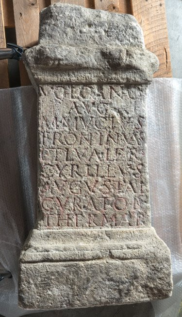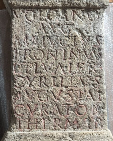 - Volcano / Aug(usto) / M(arcus) Mucius / Frontinus / et L(ucius) Valer(ius) / Cyrillus / Augustal(es) / curator(es) / thermar(um)