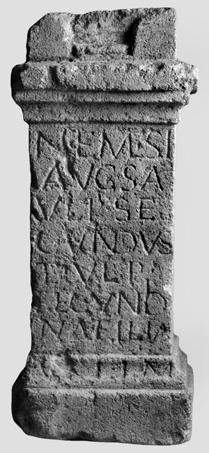 - Nemesi / Aug(ustae) sa(crum) / Ulp(ius) Se/cundus / et Ulp(ia) / Secundi/na filia / v(otum) s(olverunt) l(ibentes) m(erito)