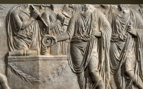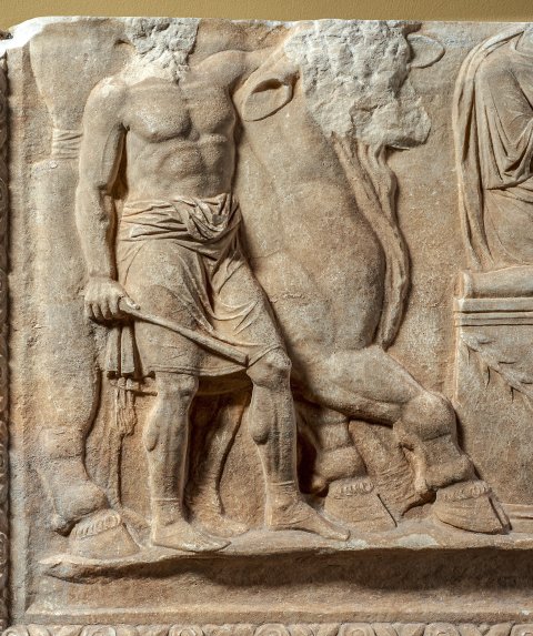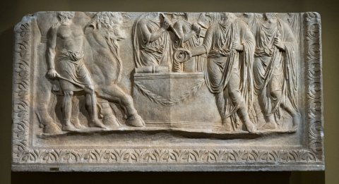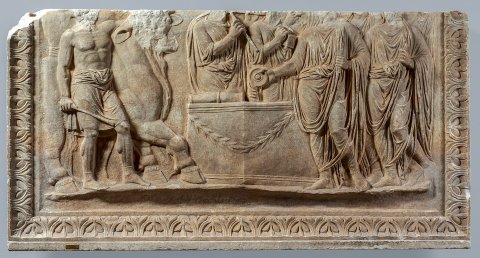 - Opferszene : Altar, rechts Togati, hinter dem Altar Musikanten, links Opferdiener mit Stier. Auf dem Rahmen lesbisches Kyma.