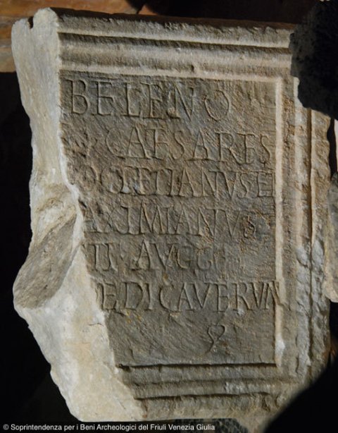 - [Apollini] Beleno / [Imperatore]s Caesares / [C(aius) Aur(elius) Val(erius) D]iocletianus et / [M(arcus) Aur(elius) M]aximianus / [P(ii) F(elices) Invi]cti Augg(usti) / [lib(entes) animo] dedicaverunt // PET[---]